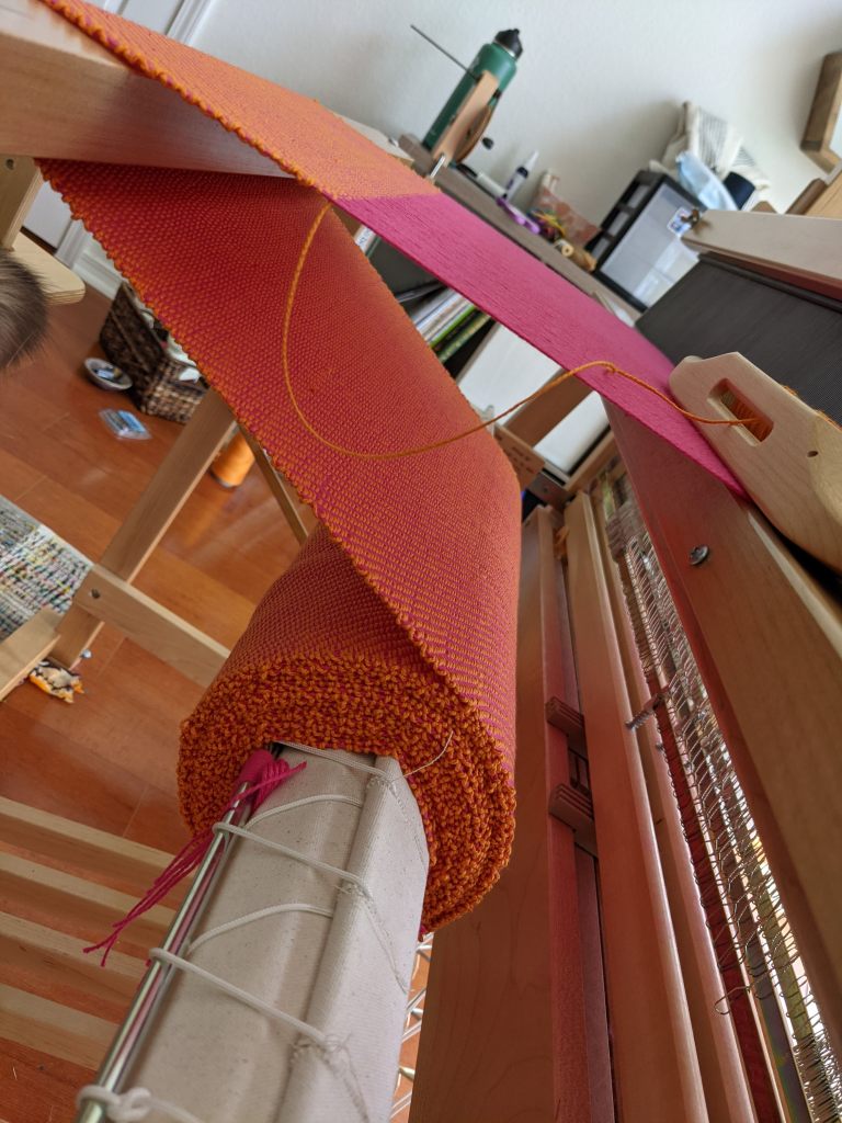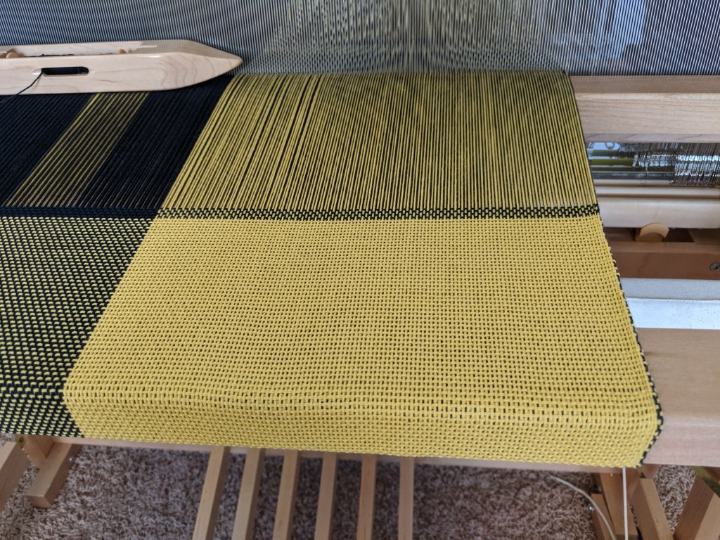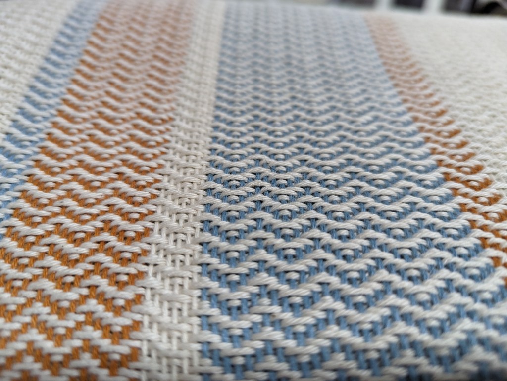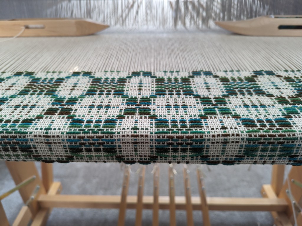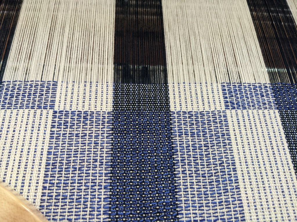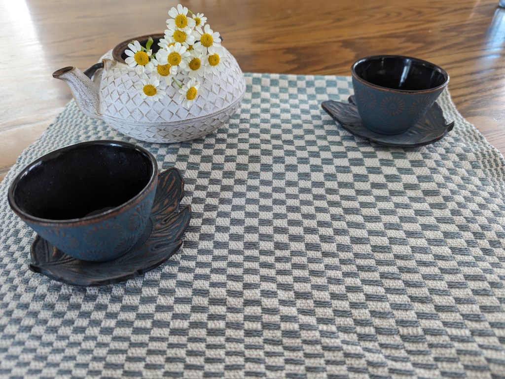 Two table runners – white one on table and plaid one on shelf, both in cotton from Gist Yarn